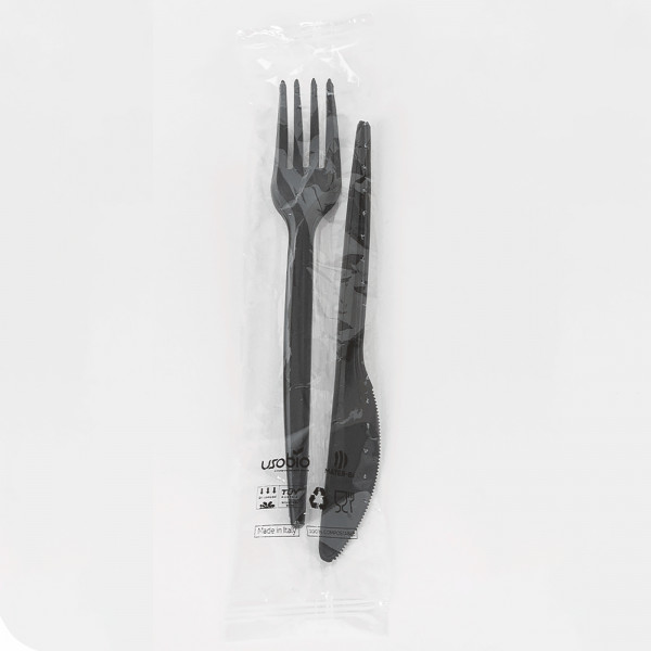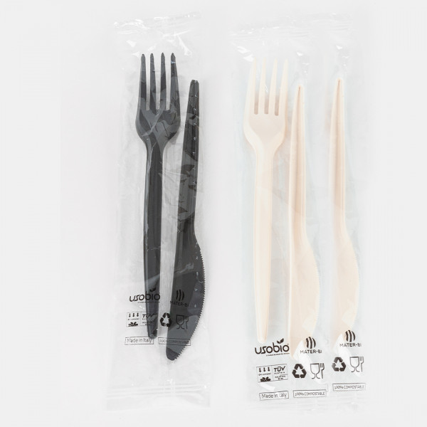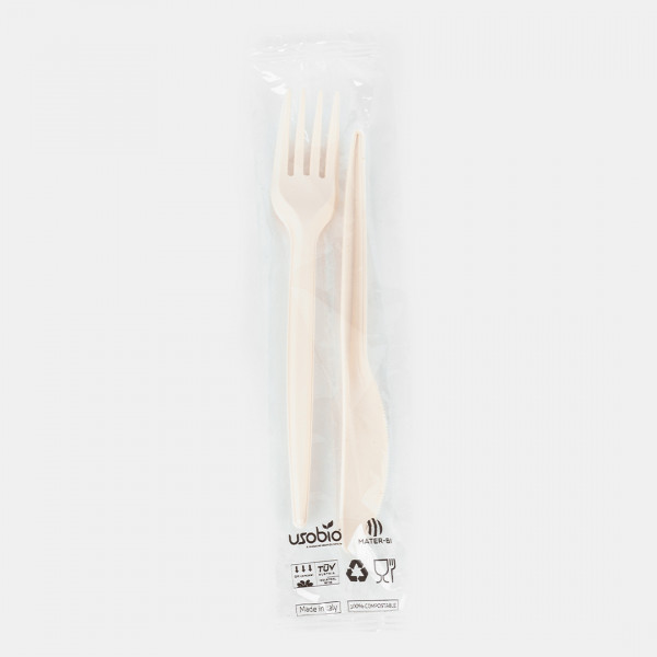Kit composto da due o tre posate in Mater-Bi, con o senza tovagliolo 2 veli. Resistenti all'acqua e all'olio. Compostabili, si possono smaltire nell'umido. Resistenti fino a 90°C.