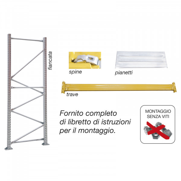 Campata iniziale composta da: 2 fiancate / 4 travi / 8 anti-sgancio per travi Campata aggiuntiva composta da: 1 fiancata / 4 travi / 8 anti-sgancio per travi Dimensioni pianetti: 30x100 cm