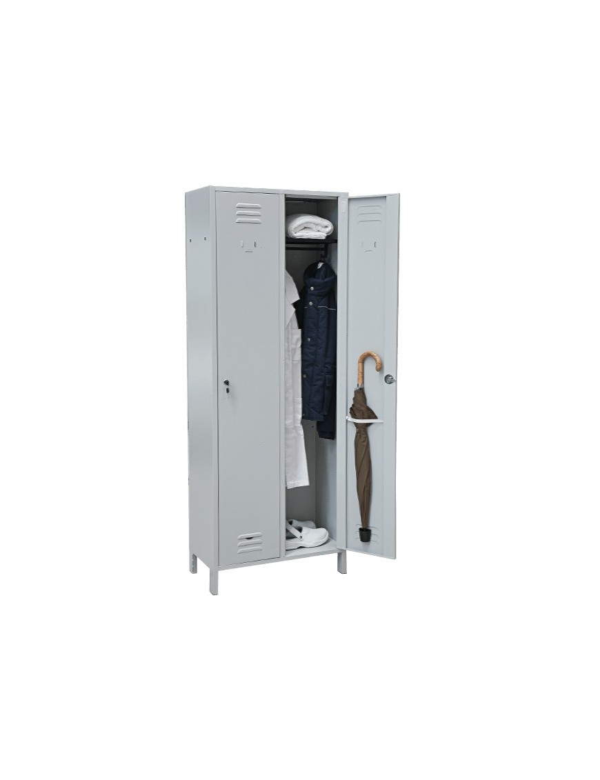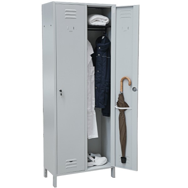 • L’armadio monoblocco è composto da due scomparti capienti con profondità pari a 34 cm, ripiano superiore, asta appendi grucce, filo porta ombrelli/asciugamani, serrature a cilindro Yale con 2 chiavi in dotazione per ogni vano, feritoie di areazione superiori e inferiori e porta cartellino stampato
