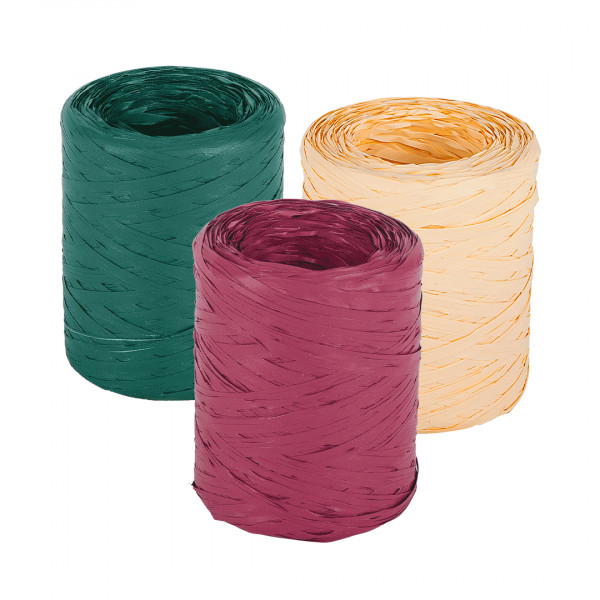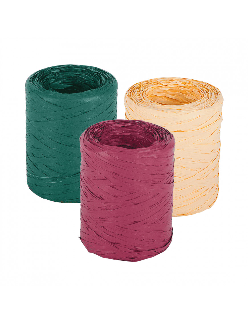 Rafia sintetica colorata in rotoli, disponibile in una varietà di colori vivaci ed eleganti per conferire alle confezioni eleganza e praticità, grazie alla facilità con cui il filo si srotola dall'interno